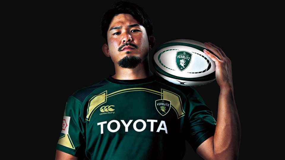 選手がラグビーボールを持った決め顔写真を使った