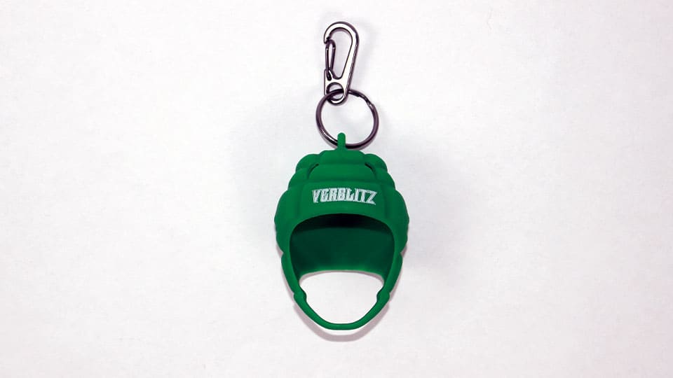ラグビー好きが一目で分かる、緑のヘッドキャップ型キーホルダー。