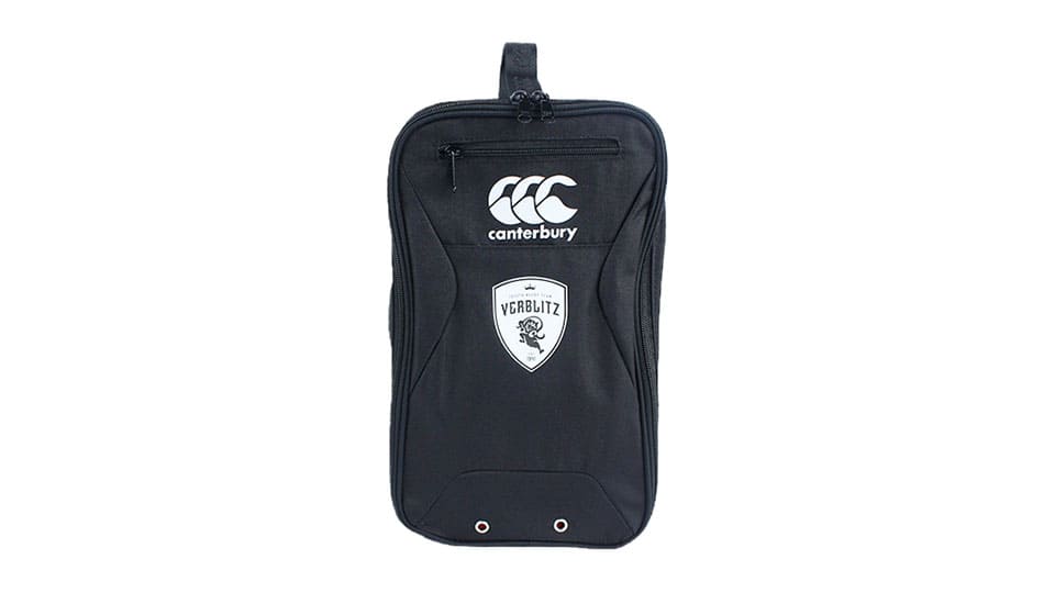 シューズバックカンタベリー×トヨタヴェルブリッツのコラボ商品。大きくコの字に開くスクエア型のシューズバッグです。